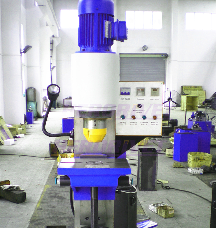BM20是为适应用户大铆钉直径、大批量而设计的一类重型立式液压铆接机。该机应用有摆辗铆接技术外,同时采用丝杆升降式工作台(机头部分固定),台面具有夹具梯形槽,工作台中心孔径与主轴轴线同轴,可用于夹具定位。